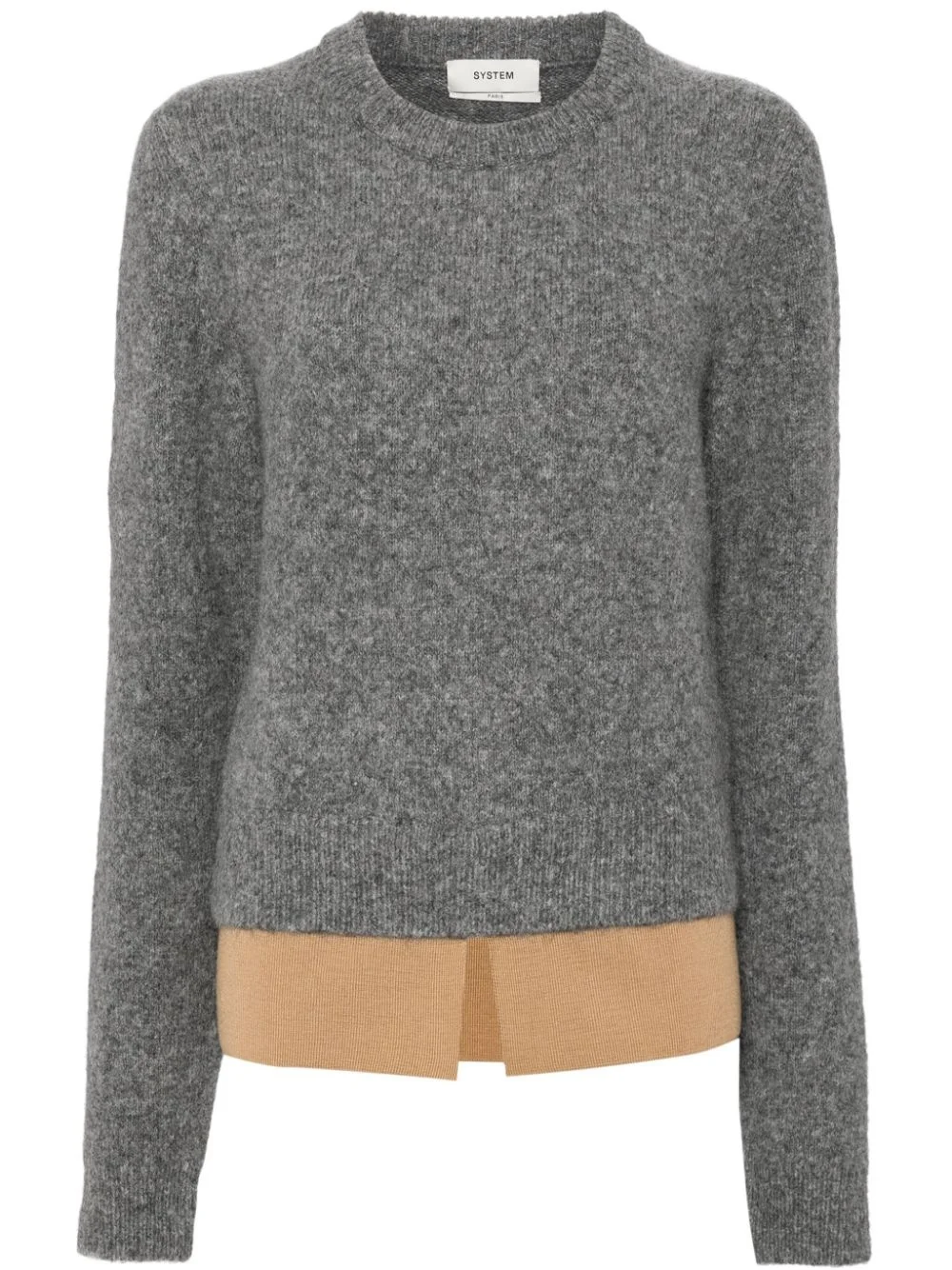 shirt layered knit top Highlights - Grey/brown - Wool blend - Layered design - Crew neck - Fine knit - Knitted construction - Long sleeves - Ribbed cuffs and hem Imported Composition Wool 44%, Nylon 37%, Mohair 17%, Polyurethane 2% Washing instructions Dry Clean Only
