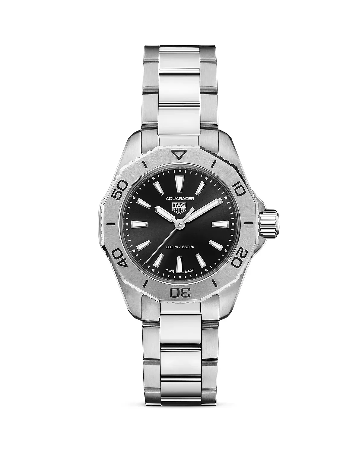 PRODUCT DETAILS - Stainless steel - Case size: 30mm - Folding clasp closure with double-push security system - Water resistant to 20 ATM - Swiss quartz movement - Black dial - Index bezel - Stainless steel link bracelet - Manufacturer's 2-year limited warranty - Photo may have been enlarged and/or enhanced - Made in Switzerland Web ID: 4314321