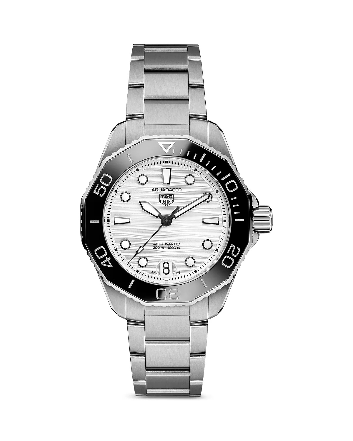 PRODUCT DETAILS - From the TAG Heuer Aquaracer collection - A sports watch with a diving legacy that goes back 125 years, this 41mm Aquaracer passes the test of timing with flying colors - Water-resistant to 300 meters, the meticulously crafted brushed and polished steel case is equipped with Easy-Grip studs and screw-down crown for optimum handling, even with diving gloves. - The triple-row steel bracelet with steel clasp and safety buttons is designed to prevent accidental openings. - Stainless steel; sapphire crystal - Case size: 36mm - Deployment buckle closure - Water resistant to 30 ATM - Automatic movement - Black dial with date display at six o'clock - Stainless steel link bracelet - Manufacturer's 2-year international warranty - Photo may have been enlarged and/or enhanced - Made in Switzerland Web ID: 4058379