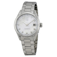 Silver-tone stainless steel case and bracelet. Fixed silver-tone stainless steel bezel. White dial with silver-tone hands and diamond hour markers. Minute markers around the outer rim. Dial Type: Analog. Date display at the 3 o'clock position. Scratch resistant sapphire crystal. Pull / push crown. Solid case back. Round case shape, case size: 32 mm, case thickness: 10 mm. Band length: 7 inches. Deployment with double push button release clasp. Water resistant at 30 meters / 100 feet. Functions: date, hour, minute. Carrera Series. Luxury watch style. Watch label: Swiss Made. Item Variations: WAR1314 BA0778, WAR1314-BA0778, WAR1314/BA0778, WAR1314BA0778. Tag Heuer Carrera White Dial Ladies Watch WAR1314.BA0778. INFORMATION Brand: Tag Heuer Series: Carrera Collection Name: Carrera Gender: Womens Model: WAR1314.BA0778 Watch Label: Swiss Made Movement: Quartz Engine: Sellita Calibre SW1000 Power Reserve: 40 hours CASE Case Size: 32 mm Case Thickness: 10 mm Case Material: Stainless Steel Case Shape: Round Case Back: Solid BAND Band Material: Stainless Steel Band Type: Bracelet Band Color: Silver-tone Band Length: 7 inches Clasp: Deployment with Double Push Button Release DIAL Dial Color: White Type: Analog Crystal: Scratch Resistant Sapphire Hands: Silver-tone Dial Markers: Diamond Second Markers: Minute Markers around the outer rim Bezel: Fixed Bezel Color: Silver-tone Bezel Material: Stainless Steel Crown: Pull / Push FEATURES Water Resistance: 30 meters / 100 feet Calendar: Date display at the 3 o'clock position Functions: Date, Hour, Minute Watch Features: Diamond, Stainless Steel, Analog ADDITIONAL INFO Watch Style: Luxury Warranty: 2 Year Jomashop Warranty UPC Code: 7612533115156 Jomashop Sku: THWAR1314BA0778 Item Variation: WAR1314 BA0778, WAR1314-BA0778, WAR1314/BA0778, WAR1314BA0778 Department: Watches Category: Watches