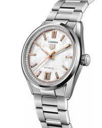 PRODUCT DETAILS - Diamonds: 0.28 ct. t.w. - Stone count: 76 diamonds - Stainless steel; 18K rose gold; sapphire crystal; mother-of-pearl - Case size: 36mm - Deployment buckle closure - Water resistant to 5 ATM - Swiss automatic movement - White mother-of-pearl dial with date display at 6 o'clock - 18K rose gold indices & diamond-set outer ring - Stainless steel link bracelet - Manufacturer's 2-year international warranty - Photo may have been enlarged and/or enhanced. - Made in Switzerland Web ID: 5191151