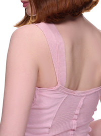 TALIA BYRE top in pink, stretch-rib knit, square neckline, dual straps, versatile wear, raw edges, exposed seams, side slits, slim fit. Standard Sizing Model is 5'7" wearing size S. Bust: 32" Waist: 25" Hip: 37"