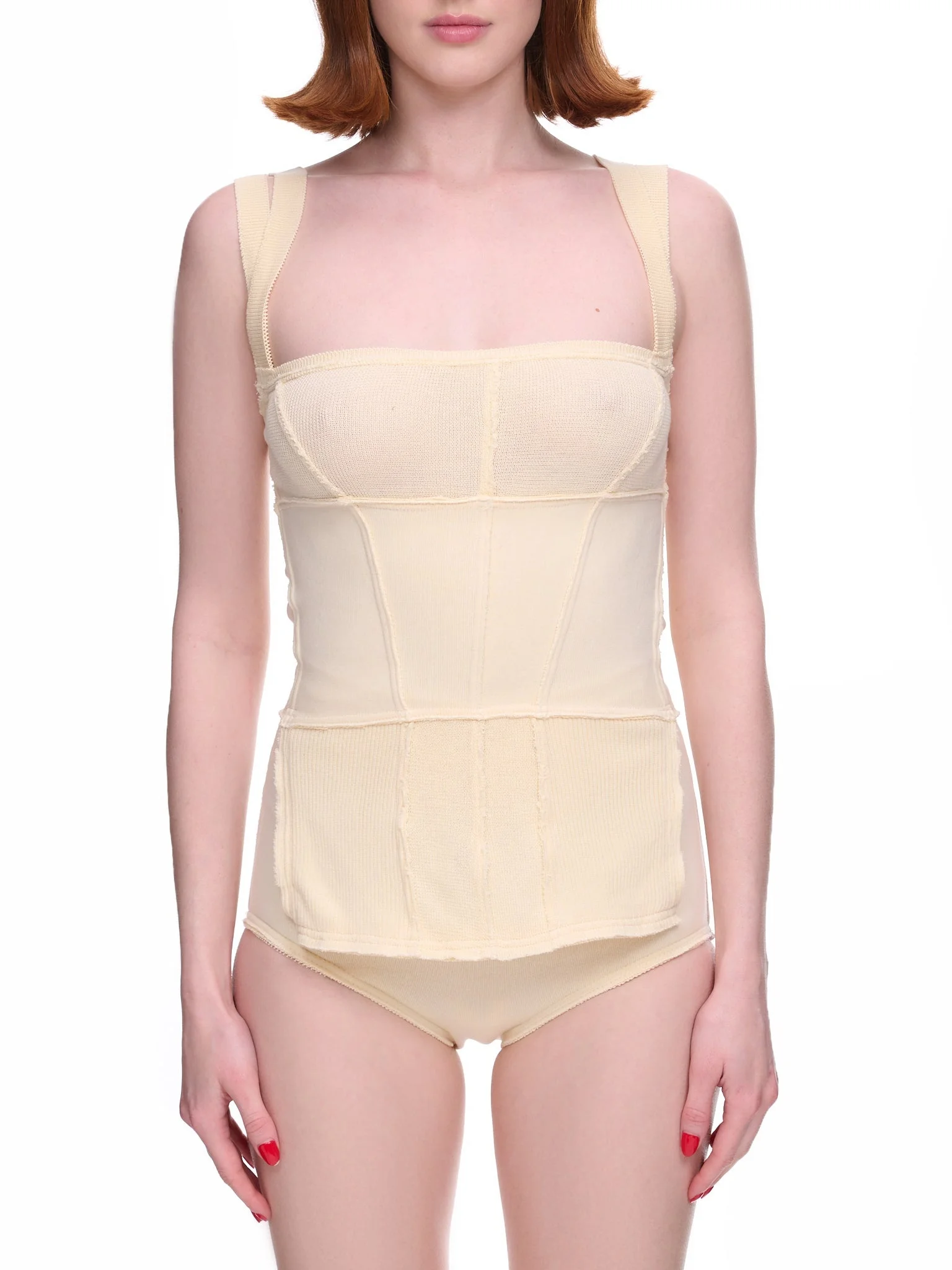 TALIA BYRE top in yellow, stretch-rib knit, square neckline, dual straps, versatile wear, raw edges, exposed seams, side slits, slim fit. Standard Sizing Model is 5'7" wearing size S. Bust: 32" Waist: 25" Hip: 37"