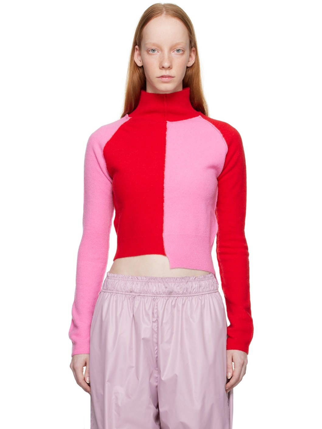 Brushed knit virgin wool turtleneck. Pinched seams throughout. · Paneled construction · Rib knit collar and hem · Asymmetric hem Supplier color: Pink/Red