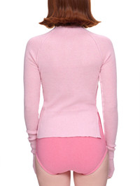 TALIA BYRE sweater in pink, stretch-rib knit, round collar, tonal button closure, raw edges, exposed seams, asymmetric hem, fitted. Standard Sizing Model is 5'7" wearing size XS. Bust: 32" Waist: 25" Hip: 37"