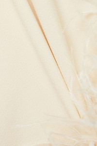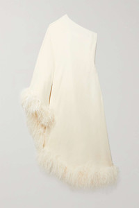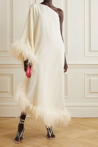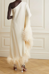 EDITORS'NOTES Taller Marmo founders Yago Goicoechea and Riccardo Audisio have a hands-on approach to design - they only work with small Italian factories in order to keep a close eye on every step of production. Cut from ivory crepe, this 'Ubud' maxi dress has a one-shoulder neckline and cascading feather trims along the cuff and asymmetric hem. Wear yours with lace-up sandals and a sculptural clutch. SIZE & FIT - Fits true to size, take your normal size - Designed for a slim fit with oversized sleeve - Lightweight, fluid, non-stretchy fabric with feather trim - Model is 175cm/ 5'9" and is wearing an IT 40 DETAILS & CARE - Ivory crepe and feathers - Concealed zip fastening along side - 78% acetate, 22% viscose; trim: 100% feathers (Ostrich) - Dry clean - Ostrich: South Africa - Made in Italy