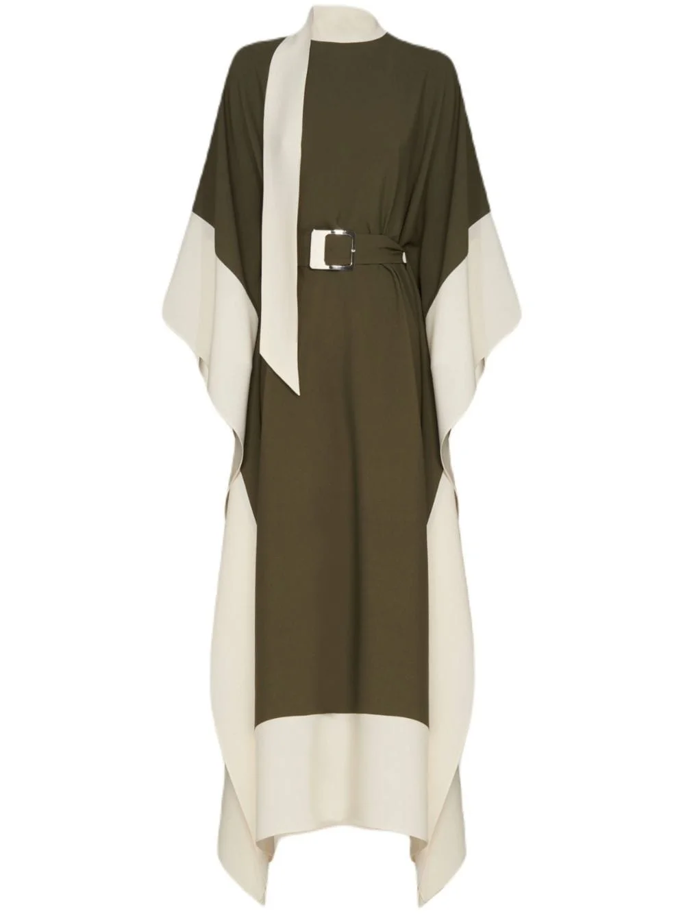Adda belted kaftan dress Highlights - Forest green/ivory - Two-tone design - Kaftan silhouette - Scarf detailing - Belted waist - Mock neck - Rear button fastening - Keyhole detail to the rear - Long sleeves - Asymmetric hem Made in Italy Composition Acetate 78%, Viscose 22%