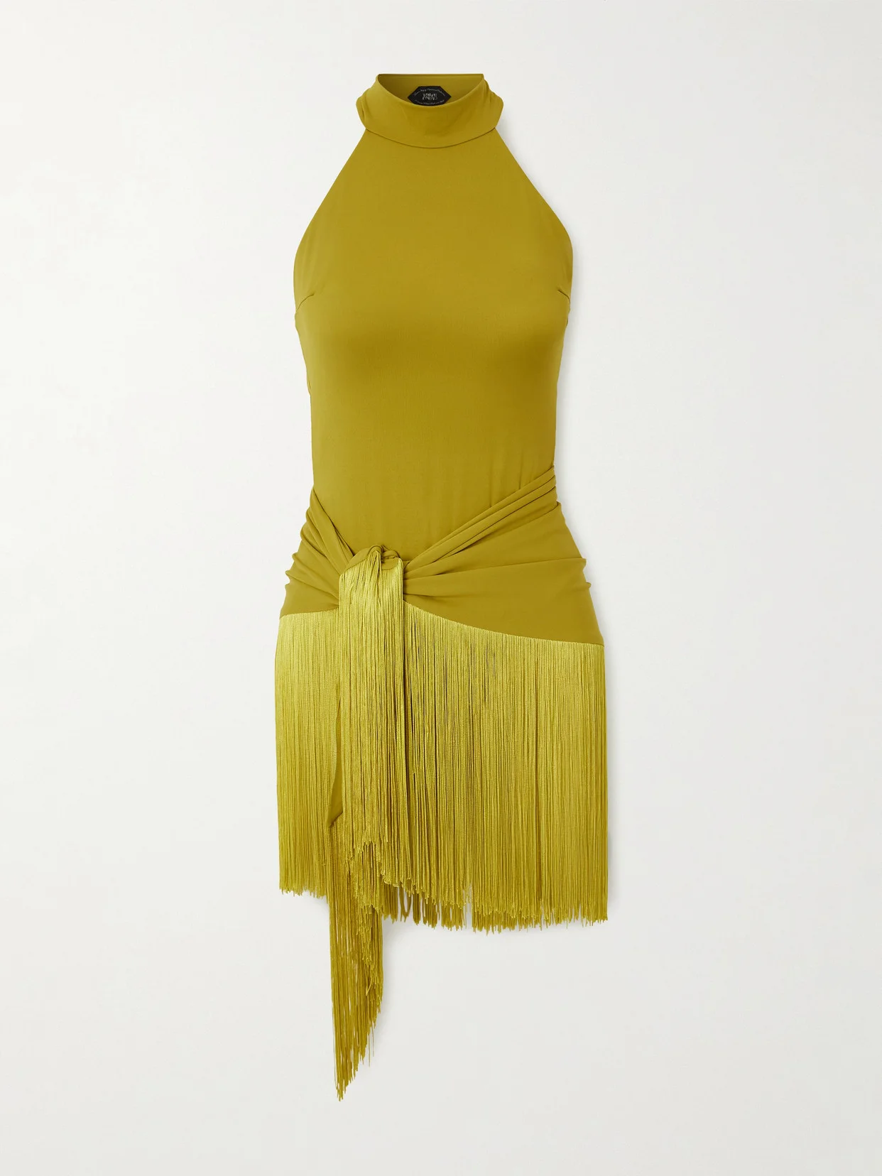 Taller Marmo's set pairs a sleek swimsuit with a matching pareo for a striking beachside outfit. Cut from stretch fabric in bold chartreuse, it features a high neckline and dramatic fringe detailing.