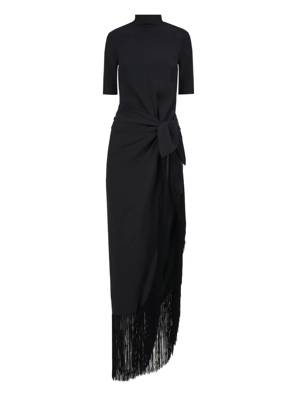 Athena dress Highlights - Black - Short sleeves - High neck - Tie fastening - Asymmetric hem - Fringe detail Made in Italy Composition Fabric 100% Washing instructions Read Manufacturer Guidelines