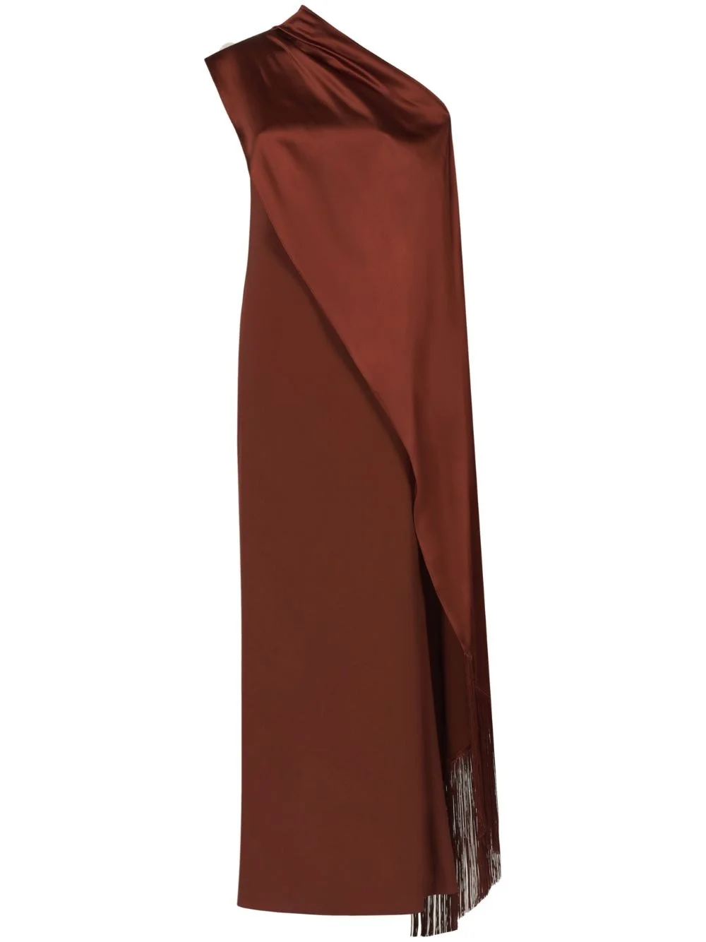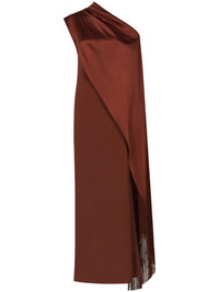 Berenson gown Highlights - Chestnut brown - Crepe texture - Concealed side zip fastening - Asymmetric neck - Sleeveless - One-shoulder - Scarf detailing - Fringe detailing - Straight hem Made in Italy Composition Acetate 78%, Viscose 22% SIZE & FIT Measurement CHEST 36.22 in(92 cm) HIPS 40.15 in(102 cm) LENGTH 63.77 in(162 cm) WAIST 31.49 in(80 cm) FittingInformation Designed for a slim fit that sits just away from the body offering a close yet comfortable fit Made from a midweight fabric