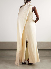 EDITORS'NOTES A beautiful example of Taller Marmo's glamorous aesthetic, this ‘Berenson’ dress has a draped one-shoulder shape cut from fluid crepe. The fringe trims accent the high slit and add to its vintage feel. SIZE & FIT Model measurements: - Fits true to size, however those who are between sizes should take the smaller size - Intended for a close fit - Lightweight, slightly stretchy fabric - Model is 177cm/ 5'10" and is wearing an IT 38 - Bust: 79cm/ 31" - Waist: 61cm/ 24" - Hip: 89cm/ 35" DETAILS & CARE - Ivory crepe - Concealed zip fastening along side - 74% acetate, 22% viscose, 4% elastane - Dry clean