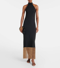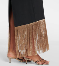 Taller Marmo's glamorous designs are crafted exclusively in Italy by expert artisans. Embodying playful elegance, the Berlin gown is crafted from crepe cady and defined by metallic fringes at the hem. Product Details - Material: 74% acetate, 22% viscose, 4% elastane - Care instructions: dry clean - Made in Italy - Color: black - Designer color name: Black - Lining: 78% acetate, 22% viscose - Trim: 64% viscose, 19% polyester, 14% nylon, 3% cotton - Closure: invisible zipper - Fringed hem - Item number: P01125890 Size & Fit - True to size - Low back - Fitted - Non-stretchy fabric - The model seen in the picture is 178cm-5'10" and wearing a size IT 40