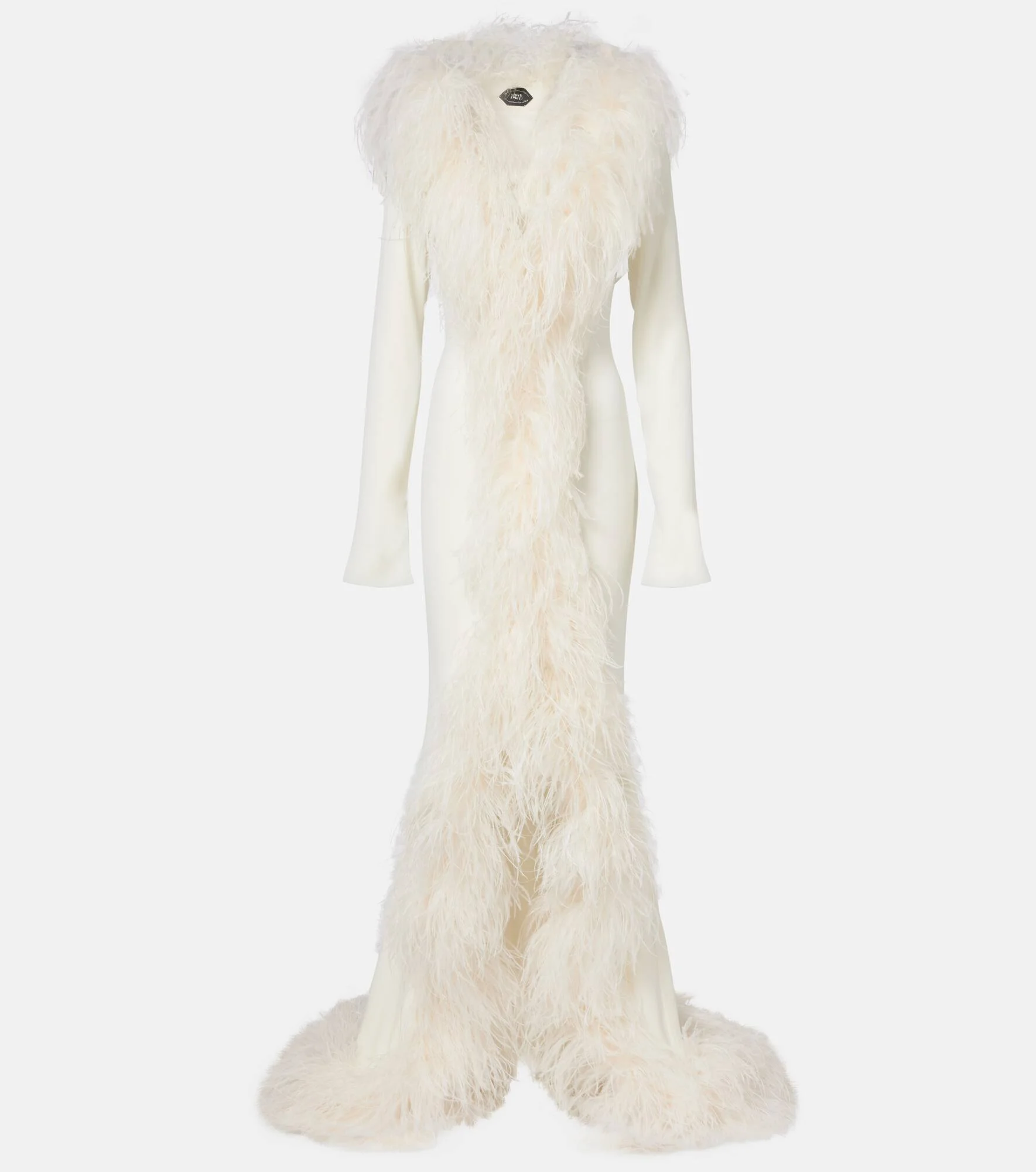 Trimmed with opulent ostrich feathers, Taller Marmo's Hollywood gown is a masterpiece of its bridal collection. The style is made in Italy from crepe and is rendered in a candid white. Product Details - Material: 74% acetate, 22% viscose, 4% elastane - Care instructions: dry clean - Made in Italy - Designer color name: Latte - Item color: white - Material II: 78% acetate, 22% viscose - Lining: 77% acetate, 23% polybutylene terephthalate - Trim: 100% ostrich feathers - Contains non-textile parts of animal origin - Closure: concealed zipped back - Item number: P01125900 Size & Fit - True to size - Semi-sheer - Fitted - Slightly stretchy fabric - The model seen in the picture is 178cm-5'10" and wearing a size IT 40
