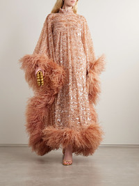 No one does old-school glamour quite like Taller Marmo - the brand defines this 'Casta Diva Sublime' gown as "a showpiece of pure extravagance". Cut from blush tulle, it's embellished with scores of sparkling sequins and traced with wispy feathers along the batwing sleeves and floor-grazing hem. The optional satin slip provides comfort and coverage. Size & Fit - Intended to be oversized; we recommend sizing down if you prefer a closer fit - Designed with a detachable, slim-fitting slip - Mid-weight, heavily embellished, non-stretchy fabric with feather trim - Model is 180cm/ 5’11” and is wearing an IT 40 Model measurements: - Bust: 77cm/ 30.25" - Waist: 61cm/ 24" - Hip: 89cm/ 35" Details & Care - Blush sequined tulle - Button-fastening keyhole at back - 100% polyester; trim: 100% feathers (Ostrich); lining: 74% acetate, 22% viscose, 4% elastane - Partially lined - Dry clean - Ostrich: South Africa