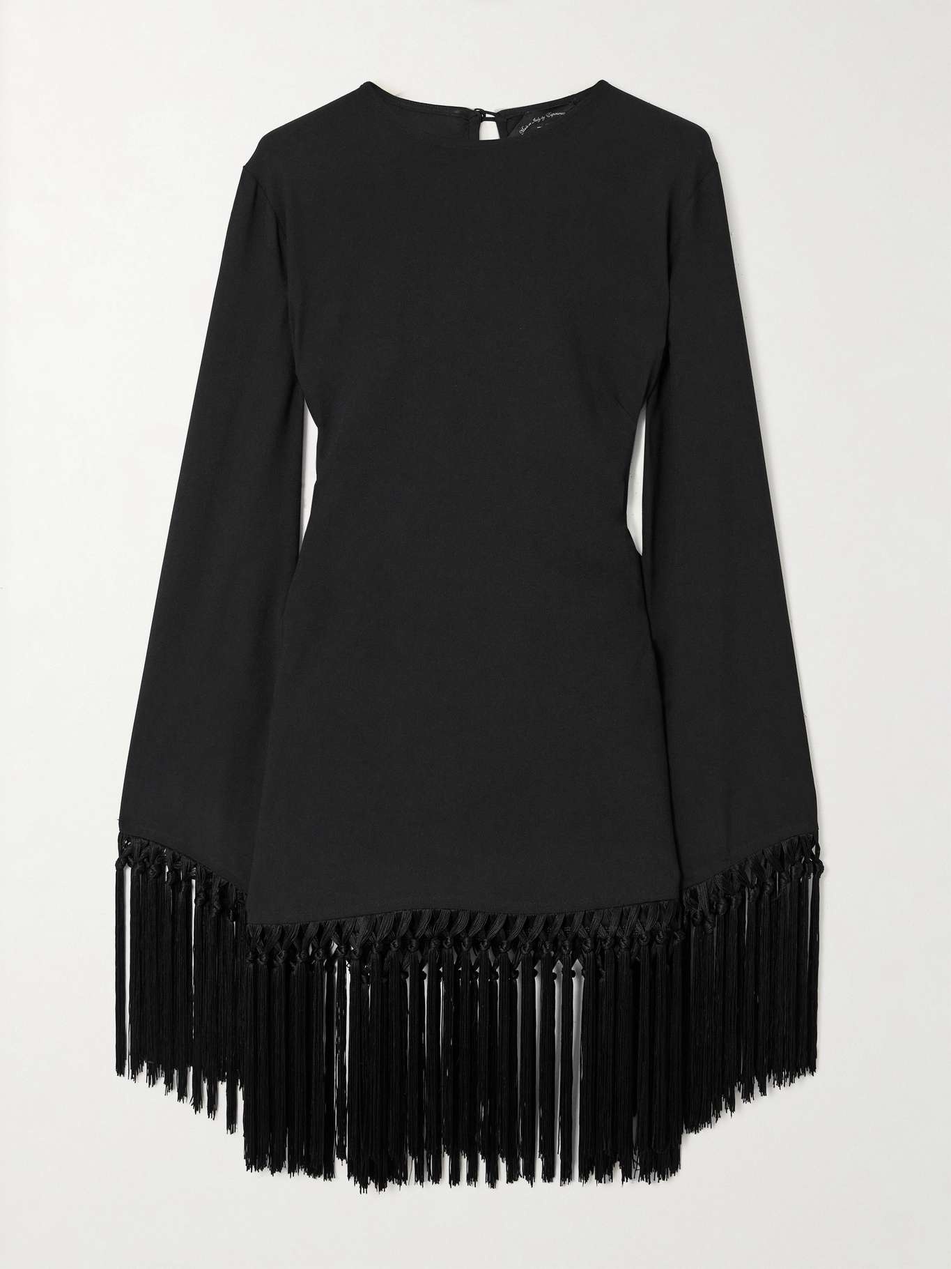 EDITORS'NOTES Taller Marmo's party dresses are rooted in an appreciation for '60s and '70s glamour. This 'Claudia' mini is cut from smooth crepe and traced with swishy fringing along the sleeves and hem. Set the mood with captivating diamond jewelry. SIZE & FIT Model measurements: - Fits true to size, take your normal size - Designed for a slightly loose fit - Mid-weight, non-stretchy fabric with fringed trim - Model is 175cm/ 5'9" and is wearing an IT 40 - Bust: 78cm/ 31" - Waist: 62cm/ 24.5" - Hip: 83cm/ 32.5" DETAILS & CARE - Black crepe - Button fastening at back - 78% acetate, 22% viscose - Dry clean