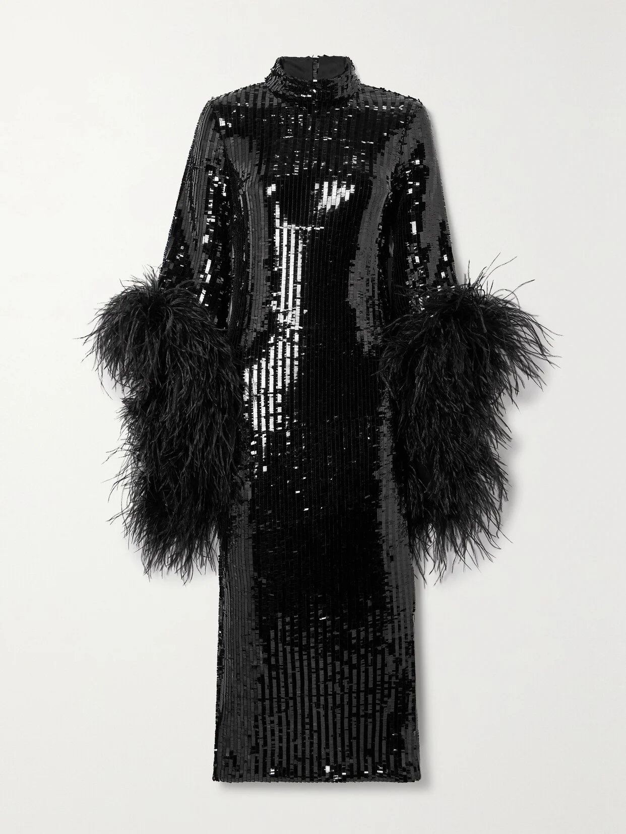 Taller Marmo's 'Del Rio Disco' dress is dripping in sparkling sequins and plush feathers, ensuring you bring the glamour to any party. It has a high neckline and a figure-skimming fit balanced by voluminous flared sleeves. When it comes to styling, more is more, so complete your outfit with a glittering cocktail ring and earrings.