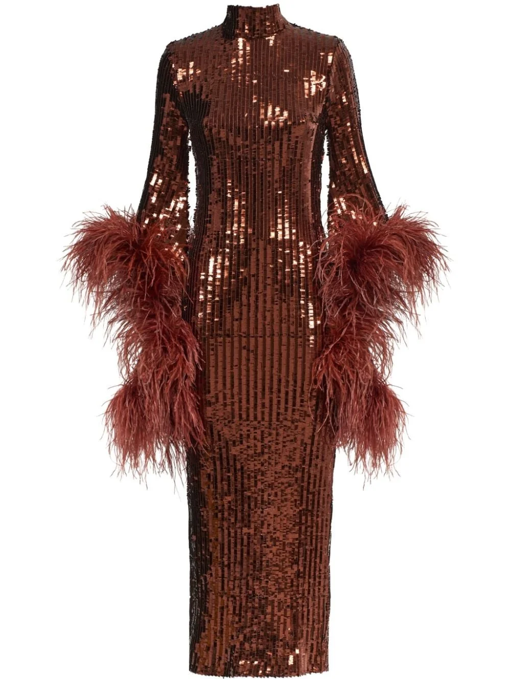 Del Rio Disco sequinned midi dress Highlights - Coffee brown - Sequin design - Ostrich feather - Feather-trim detailing - Mock neck - Concealed rear fastening - Rear slit - Long sleeves - Mid-length Made in Italy Composition Lining: Polyester 100% Outer: Polyester 100%, Ostrich Feather 100%, Sequin 100%