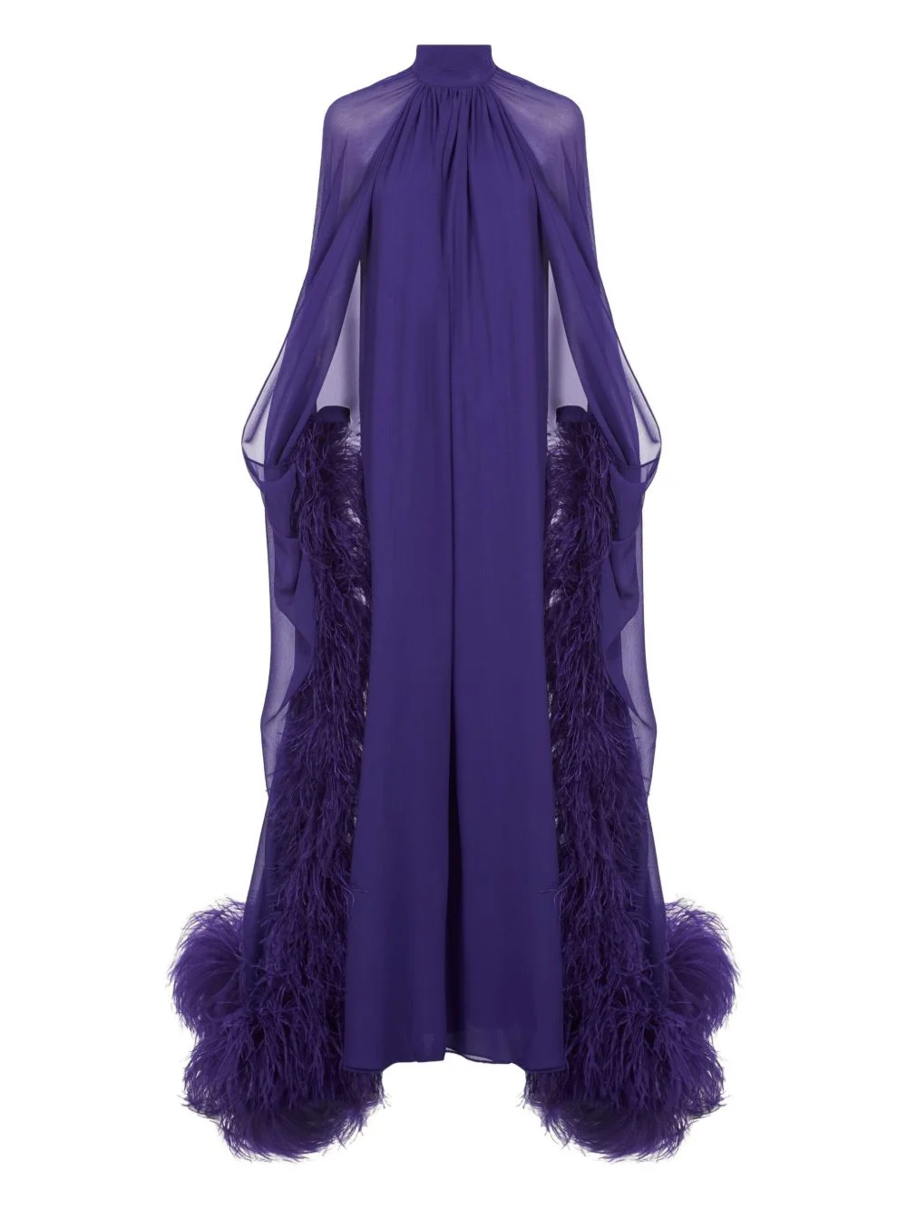 Feathered Eterea maxi gown Highlights - Violet - Feather trim - High neck - Cape sleeves - Gathered detail - Silk Made in Italy Composition Outer: Silk 100%, Ostrich Feather 100% Lining: Rayon 100% Washing instructions Dry Clean Only