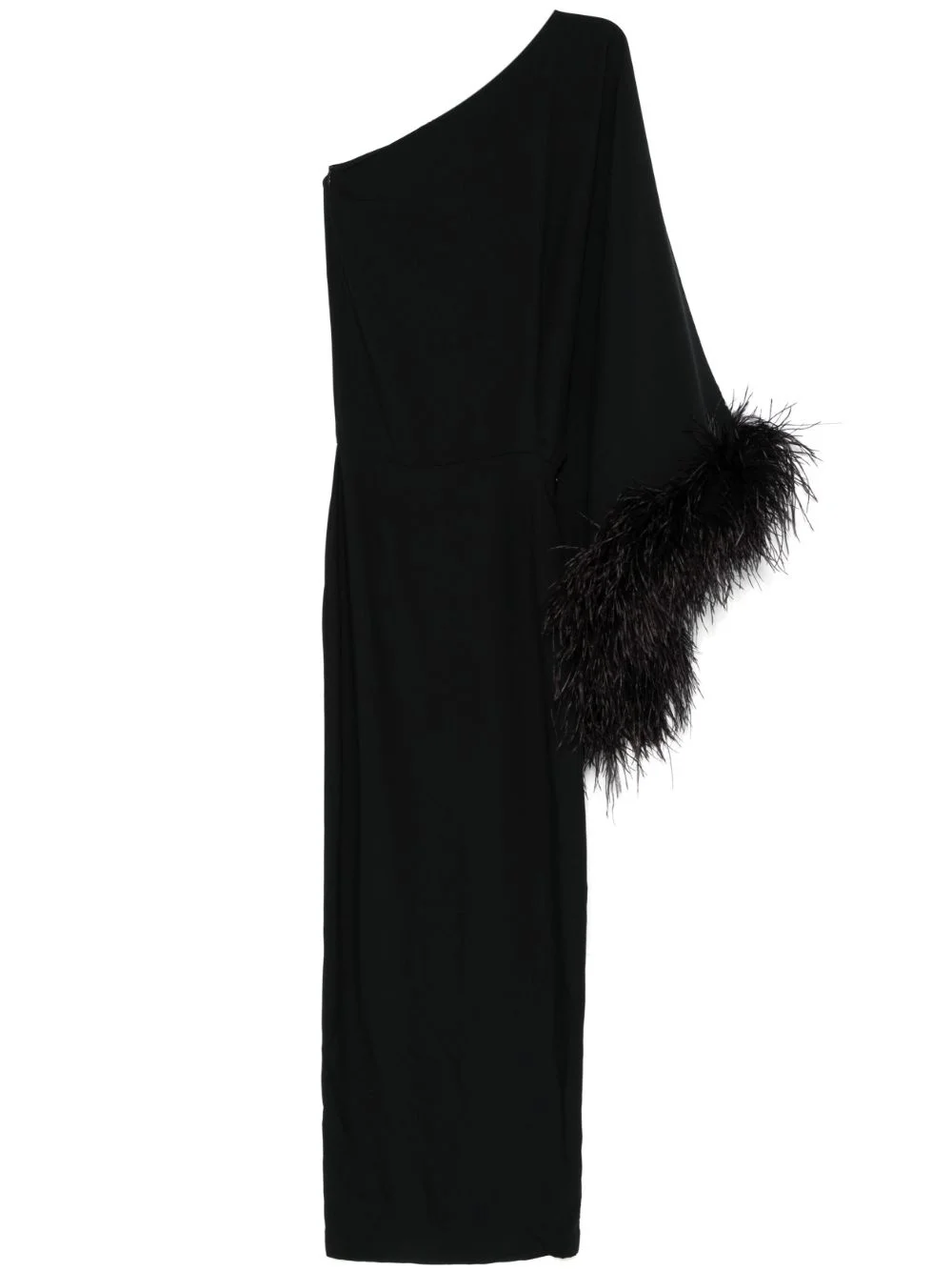 Feathered Eternity maxi dress Highlights - Black - Crepe texture - Concealed side zip fastening - Asymmetric neck - One-shoulder - Feather cuff - Single batwing sleeve - Cut-out detailing - Pleat detailing - Dart detailing - Rear slit - Unlined - Straight hem - Long length Made in Italy Composition Acetate 78%, Viscose 22% SIZE & FIT Model measurements Height 5 ft 10 in(1.77 m) Bust/Chest 30.7 in(78 cm) Hips 35.03 in(89 cm) Waist 23.62 in(60 cm) FittingInformation Designed for a slim fit that sits just away from the body offering a close yet comfortable fit Made from a midweight non-stretch fabric