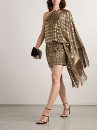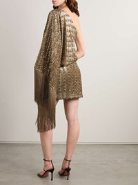 EDITORS'NOTES Headquartered in Milan, Taller Marmo collaborates with local, family-owned factories to create its glamorous occasionwear. This 'Eternity' mini dress is made from satin and saturated with a wash of gold sequins that are arranged to create a subtle stripe pattern. The single sleeve is trimmed with dramatic fringing that swishes with your every move. SIZE & FIT Model measurements: - Fits true to size, take your normal size - Designed to be fitted at the hip with a loosely cut top - Mid-weight, heavily embellished, non-stretchy fabric - Model is 175cm/ 5'9" and is wearing an IT 40 - Bust: 76cm/ 30" - Waist: 61cm/ 24" - Hip: 85cm/ 34" DETAILS & CARE - Gold satin - Concealed zip fastening along side - 100% polyester; lining: 78% acetate, 22% viscose - Dry clean