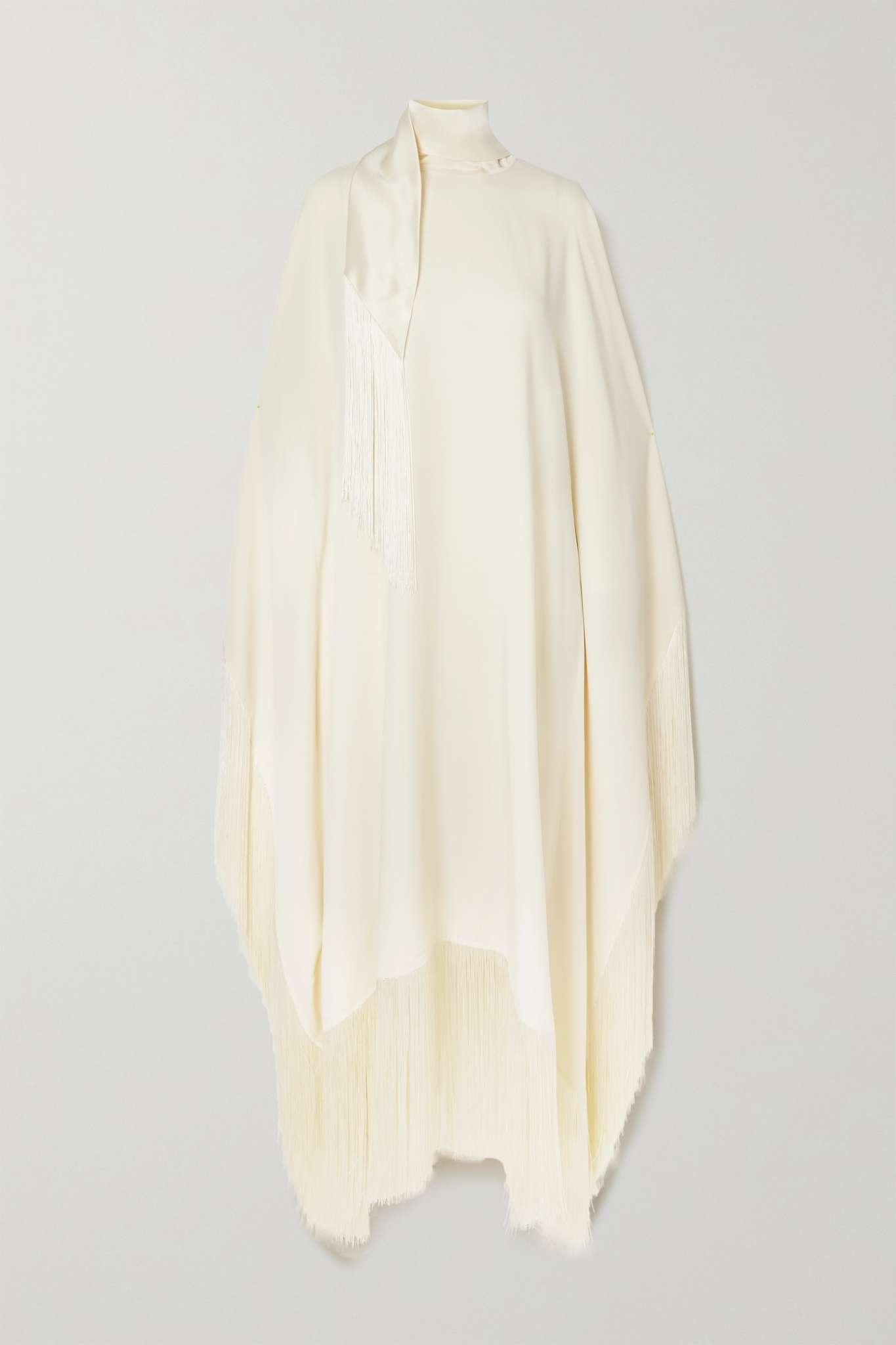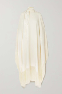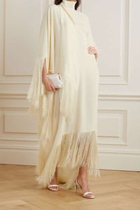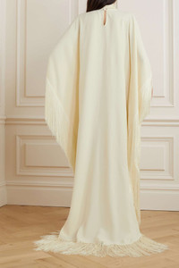 EDITORS'NOTES Taller Marmo's 'Mrs Ross' kaftan is inspired by gowns worn by the glamorous diva herself, Diana. Cut from crepe that drapes beautifully, it has satin ties at the high neck and sweeping fringe along the wide sleeves floor-pooling hem. This ivory version is designed for brides and can be worn long after the big day. SIZE & FIT - Designed for a draped silhouette, cut to be worn very loose - Mid-weight, non-stretchy fabric - Comfortably fits those who are between a size XSmall-XLarge and all body shapes - Length: 181cm / 71.3in DETAILS & CARE - Ivory crepe - Button-fastening keyhole at back - 78% acetate, 22% viscose; trim: 100% acetate - Dry clean