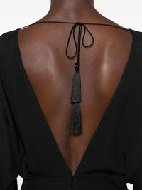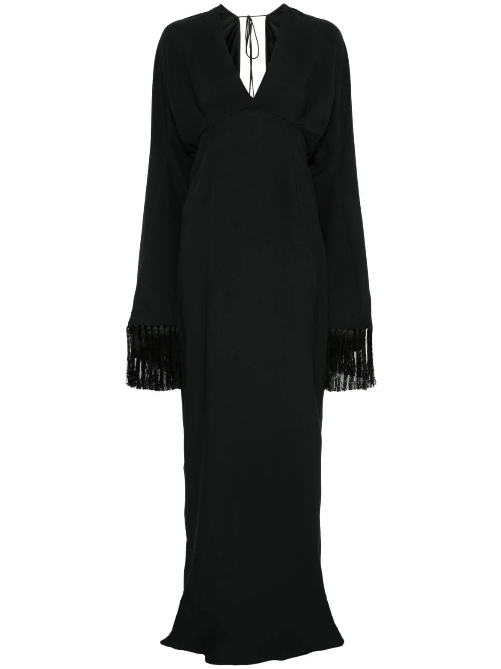 Magnifique gown Highlights - Black - Crepe texture - Concealed rear zip fastening - Plunging v-neck - Long wide sleeves - Fringe detailing - Side slit - Straight hem Made in Italy Composition Acetate 78%, Viscose 22% SIZE & FIT Model measurements Height 5 ft 10 in(1.77 m) Bust/Chest 32.28 in(82 cm) Hips 35.03 in(89 cm) Waist 25.19 in(64 cm) Measurement SLEEVE LENGTH 29.13 in(74 cm) HIPS 35.43 in(90 cm) LENGTH 61.81 in(157 cm) WAIST 27.16 in(69 cm) FittingInformation Designed for a loose fit at the chest with a close fit over the waist and hips The vented hem offers movement at the rear Made from a midweight non-stretch fabric