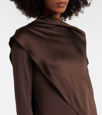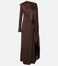 Embrace sophistication with Taller Marmo's designs, like the Mounia gown. This floor-sweeping style is made from lustrous crepe cady, featuring a fluid cape detail that's trimmed with fringes. Product Details - Material: 74% acetate, 22% viscose, 4% elastane - Care instructions: dry clean - Made in Italy - Designer color name: Chocolate - Item color: brown - Material II: 78% acetate, 22% viscose - Trim: 100% acetate - Closure: concealed zipped back - Fringed hem - Item number: P01104097 Size & Fit - Fits large to size - we recommend trying one size smaller - Cinched waist - Loose outer layer - Non-stretchy fabric - slit length 65cm-25.5" - The model seen in the picture is 178cm-5'10" and wearing a size IT 38