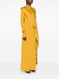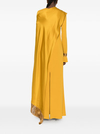 fringed draped maxi dress Highlights - Yellow - Long sleeves - Fringed hem - Draped detailing - Slit detail - Round neck Made in Italy Composition Acetate 74%, Viscose 22%, Elastane 4% Washing instructions Dry Clean Only