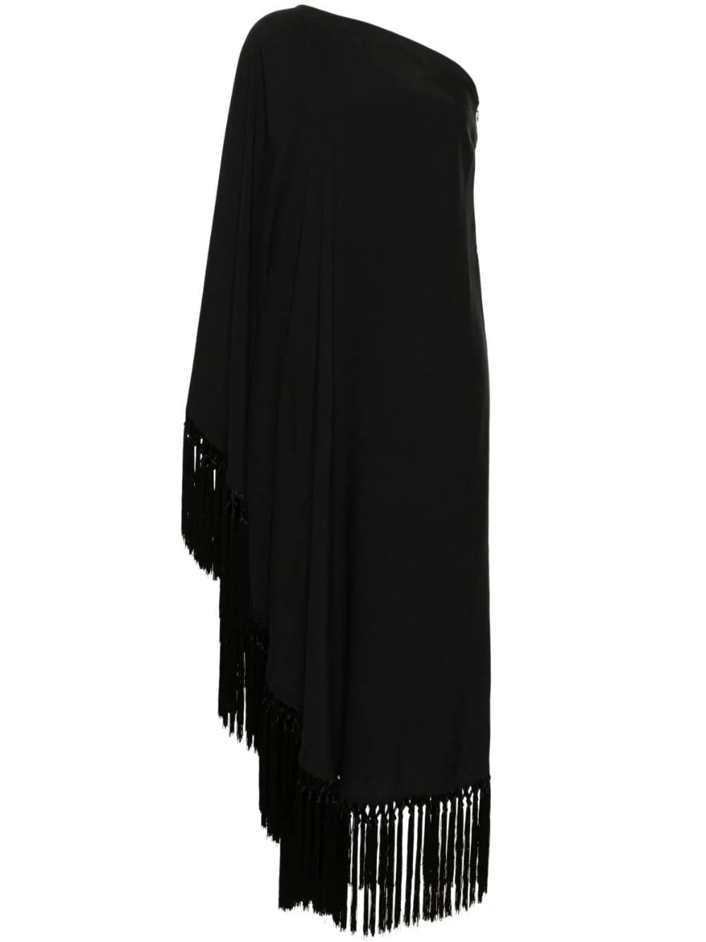 one-shoulder fringed midi dress Highlights - Black - Crepe texture - Fringe detailing - Asymmetric neck - Single long sleeve - Asymmetric hem - Mid-length Made in Italy Composition Acetate 78%, Viscose 22% SIZE & FIT Model measurements Height 5 ft 10 in(1.77 m) Bust/Chest 33.07 in(84 cm) Hips 37 in(94 cm) Waist 24.8 in(63 cm) FittingInformation Designed for a relaxed fit, this piece allows for comfort and movement when worn Made from a midweight non-stretch fabric This piece fits true to size – take your usual size Measurement LENGTH 57.08 in(145 cm)