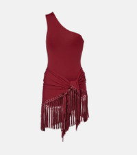 A glamorous option for pool days, this set from Taller Marmo includes two styles in soft jersey: an elegant one-shoulder swimsuit and a beach cover-up trimmed with hand-tied fringes. Product Details - Material: 86% polyamide, 14% elastane - Care instructions: hand wash - Made in Italy - Designer color name: Burgundy - Item color: burgundy - Trim: 100% acetate - Two-piece set - Fringed ends - Includes: dust bag - Item number: P01125909 Size & Fit - True to size - Loose outer layer - Unpadded Top - Medium-cut leg - The model seen in the picture is 178cm-5'10", cup size B, and wearing a size XS