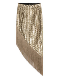 sequin-embellished midi skirt Highlights - Gold-tone - Side button and zip fastening - Fringe detailing - Asymmetric design Made in Italy Composition Lining: Acetate 77%, Polybutylene Terephthalate (PBT) 23% Outer: Polyester 100%
