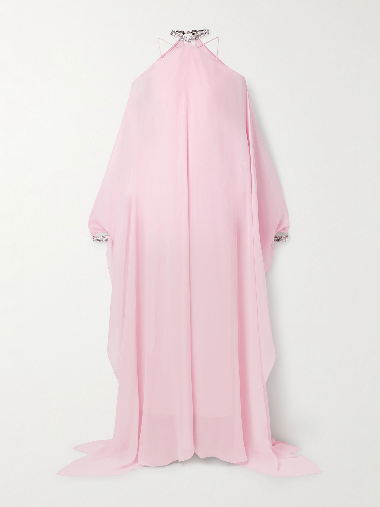 Taller Marmo's collections channel vintage glamour, inspired by the likes of Diana Ross, Peggy Guggenheim and Elizabeth Taylor. This gown is cut from baby-pink silk-crepon that billows beautifully with every step. It's fully lined for coverage and has a cold-shoulder neckline and cuffs adorned with sparkling Swarovski crystals. Size & Fit - Fits true to size, take your normal size - Designed for a draped silhouette, cut to be worn very loose - Designed with a slim-fitting slip - Lightweight, fluid, non-stretchy fabric - Model is 180cm/ 5’11” and is wearing an IT 40 Model measurements: - Bust: 79cm/ 31" - Waist: 61cm/ 24" - Hip: 89cm/ 35" Details & Care - Baby pink silk-crepon - Clasp fastening at neck, concealed hook and zip fastening at back - 100% silk - Fully lined - Hand wash