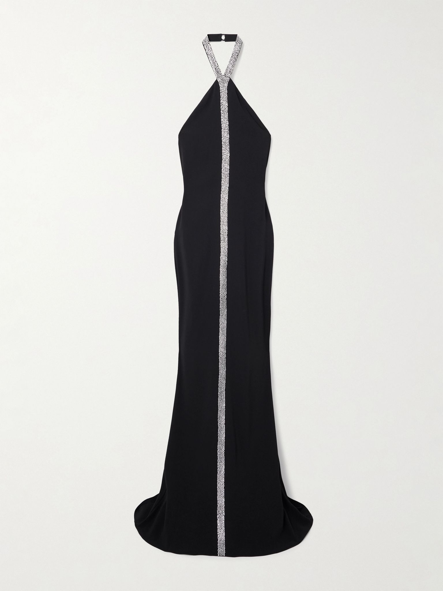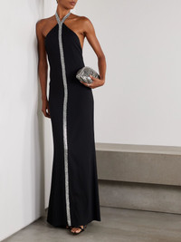 Taller Marmo describes its 'Acropoli' gown as "poised and powerful", so it's perfect for life's most glamorous evenings. Cut from fluid crepe, it's embellished with scores of glittering Swarovski crystals that draw the eye from the elegant halterneck to the pooling, floor-length hem. The open back makes it striking from all angles. Size & Fit - Fits true to size, however those who are between sizes should take the smaller size - Designed for a slim fit - Mid-weight, slightly stretchy fabric - Model is 177cm/ 5'10"and is wearing an IT 40 Model measurements: - Bust: 86cm/ 34" - Waist: 65cm/ 25.5" - Hip: 90cm/ 35.5" Details & Care - Black crepe - Button fastenings keyhole at neck; concealed zip fastening along back - 74% acetate, 22% viscose, 4% elastane; lining: 77% acetate, 23% polybutylene terephthalate - Fully lined - Dry clean