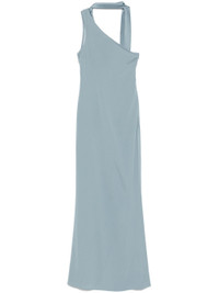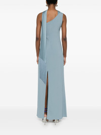 cerulean blue crepe texture concealed side zip fastening asymmetric neck one-shoulder sleeveless draped panel detail fringe detailing dart detailing rear slit unlined straight hem long length - Color: BLUE - Made in: Italy - Designer Style ID: PS2505 609 Composition and care Acetate: 74.0%, Viscose: 22.0%, Elastane: 4.0%