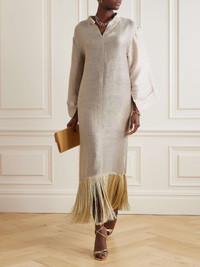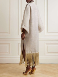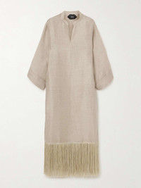 EDITORS'NOTES Taller Marmo's 'Tigris' gown is made from linen-blend dupioni - the premium textile has a satin-like luster, but is more structured, and organically wefted. It has a loose shape with wide sleeves and a dramatic fringe that sways beautifully as you walk. SIZE & FIT Model measurements: - Fits true to size, however those who are between sizes should take the smaller size - Designed for a loose fit - Dropped shoulder seam - Mid-weight, non-stretchy fabric with fringed trim - Model is 177cm/ 5'10" and is wearing an IT 38 - Bust: 82cm/ 32.5" - Waist: 66cm/ 26" - Hip: 90cm/ 35.5" DETAILS & CARE - Ecru linen-blend dupioni and fringes - Slips on - 57% linen, 30% viscose, 13% polyamide; trim: 50% viscose, 50% acetate - Professional clean