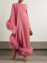 EDITORS'NOTES Inspired by classic Hollywood icons like Elizabeth Taylor and Sophia Loren, Taller Marmo's collections embrace maximalist glamor. Cut from crepe for a fluid drape, the cascading hem of this 'Ubud' gown is trimmed with plumes of feathers. Add sparkling drop earrings to draw attention to the one-shoulder neckline. SIZE & FIT - Fits true to size, take your normal size - Cut for a slightly loose fit with oversized sleeves - Mid-weight, non-stretchy fabric - Model is 180cm/ 5'11" and is wearing an IT 40 DETAILS & CARE - Pink crepe and feathers - Slips on - 78% acrylic, 22% viscose; trim: 100% feathers (Ostrich) - Dry clean - Designer color: Peony - Ostrich: South Africa