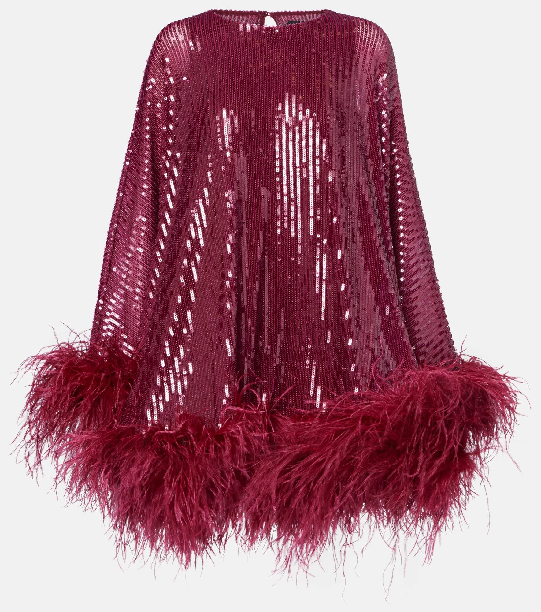 Taller Marmo infuses European craftsmanship with the vibrancy of the Middle East. Made from chiffon, the Vegas kaftan is cut to a mini length and features all-over sequins and feather trims. Product Details - Material: 100% polyester - Care instructions: dry clean - Made in Italy - Designer color name: Burgundy - Item color: burgundy - Lining: 100% polyester - Trim: 100% ostrich feathers - Contains non-textile parts of animal origin - Closure: button fastening - Item number: P01104100 Size & Fit - True to size - One size: perfect fit for sizes XS-L - Designed for a loose fit - Non-stretchy fabric