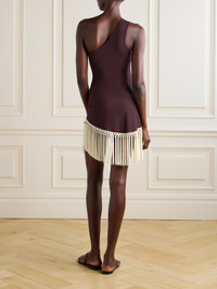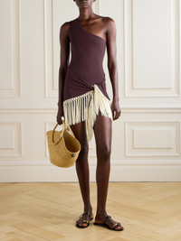 Taller Marmo's 'Yacare' set includes a one-shoulder swimsuit and matching pareo traced with swishy fringing. They're both made from smoothing stretch fabric and come in a rich burgundy.