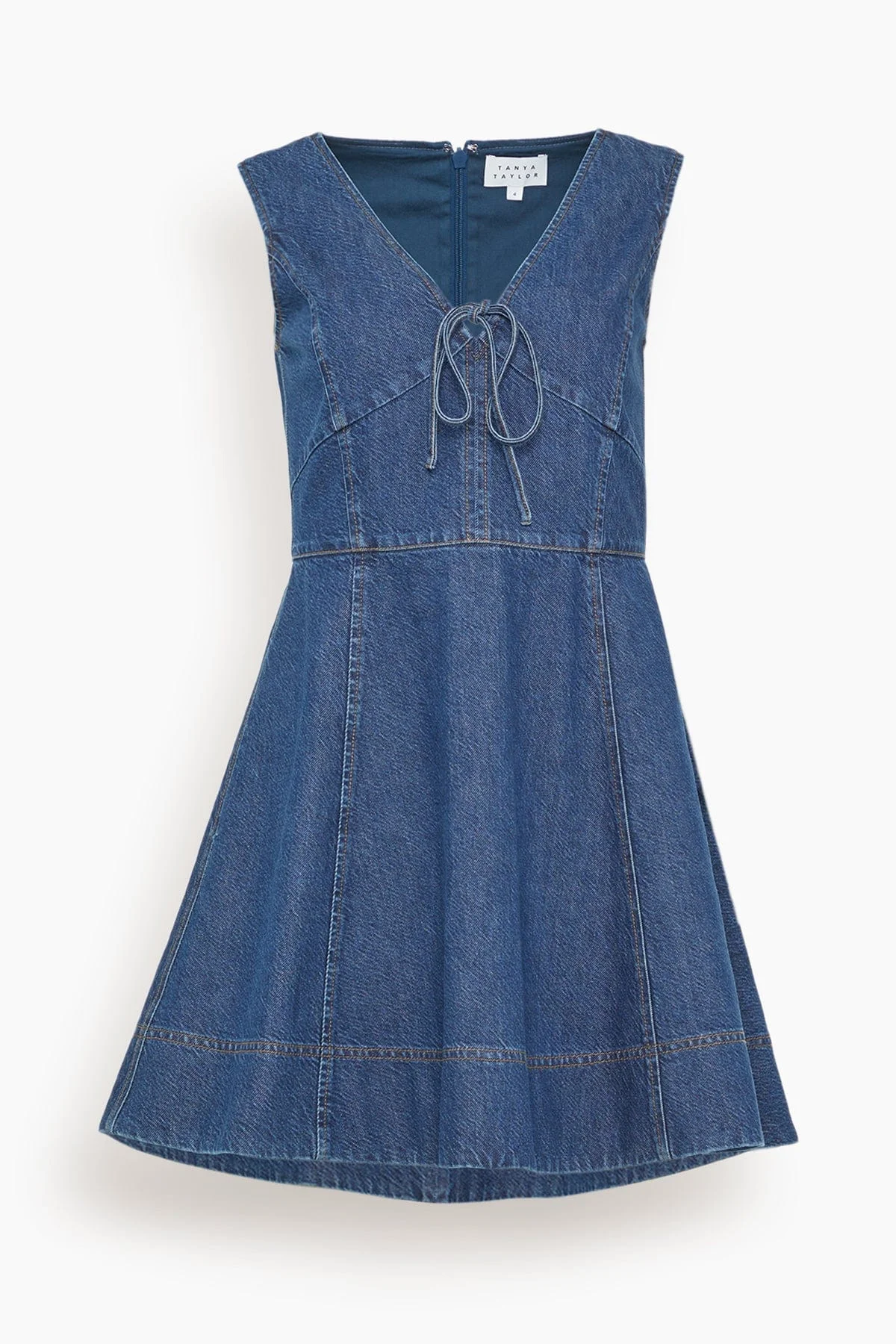 Designed in a crisp medium indigo denim, the Tanya Taylor Nova Dress is an elevated mini designed to transition you into the cooler fall months and beyond. Featuring a v-neck with a tie at the front and a feminine A-line fit, Nova is a classic denim mini dress with a polished twist. Style with flats or boots for a transitional look. FIT DESCRIPTION MODEL MEASUREMENTS - Fits true to size, take your normal size - Mini length - V-neck - Sleeveless - Lined bodice - Tie at center front - Center back zipper - Self: 100% Cotton - Lining: 65% Polyester, 35% Cotton - Harriet is wearing a size 2 - Bust: 32" - Waist: 24" - Hips: 30.5" - Height: 5’8.5”