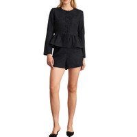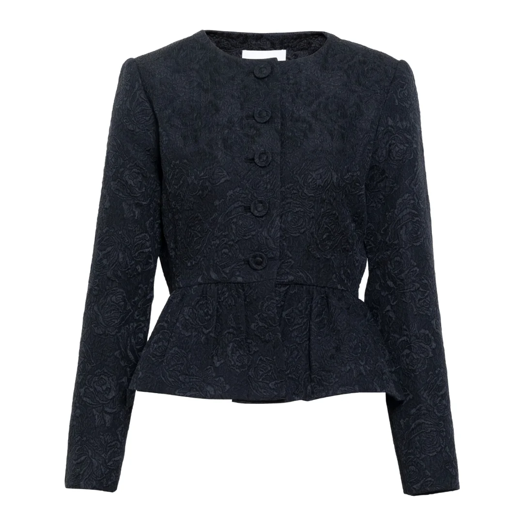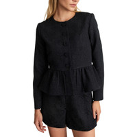 Designed in a luxe cloque jacquard, the Karleigh Jacket is a holiday staple elevated with fresh detail and just the right amount of attitude. Featuring a crew neckline, button-up front, and a cropped fit with a peplum hem, Karleigh is as chic as it is easy with an everyday polish. - Long sleeve - Fully lined - Crew neck - Jacquard - Peplum hem - Button up front - Jacket is 22.5" long from high point shoulder