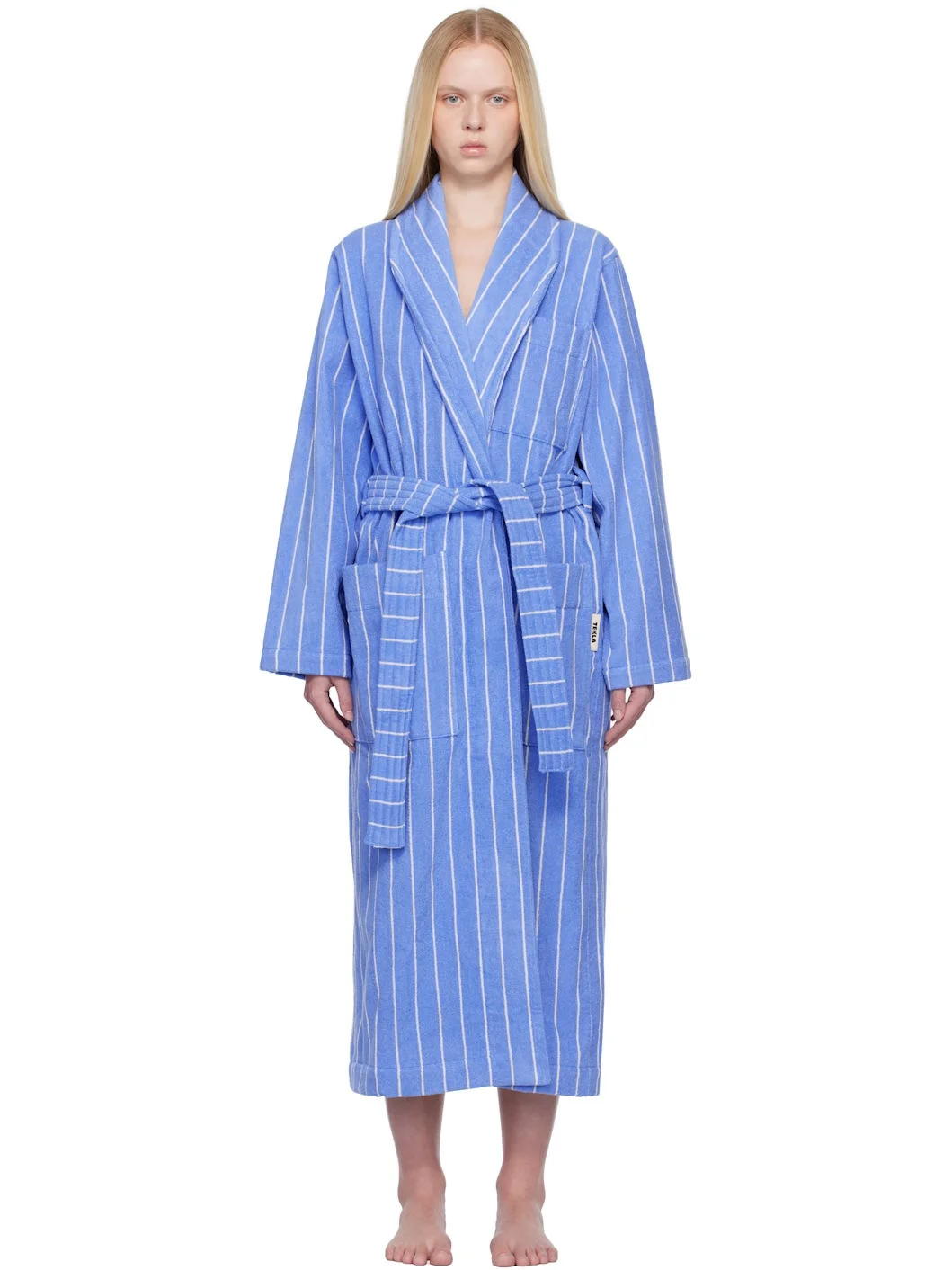 Heavyweight 385 gsm organic cotton terrycloth bathrobe. Stripes throughout. · Certified GOTS and OEKO-TEX® Standard 100 · Shawl collar · Open front · Belt loops and detachable self-tie belt · Patch pockets · Logo flag at side seam · Locker loop at inner collar Supplier color: Marseille stripes 100% cotton. Made in Portugal 252482F077001