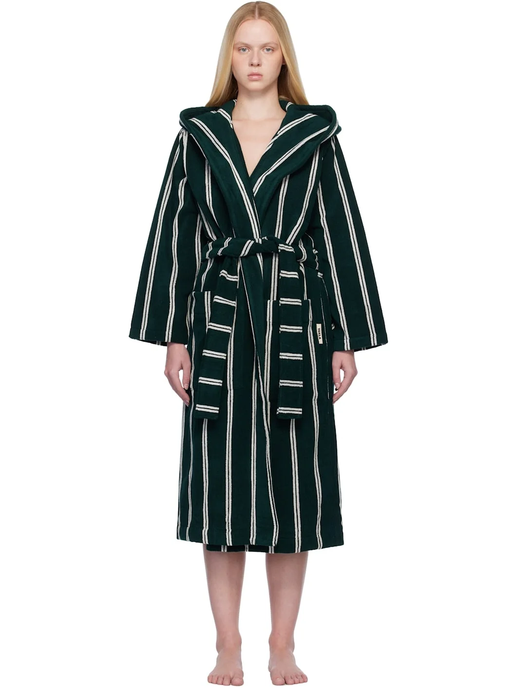 Heavyweight 385 gsm organic cotton terrycloth bathrobe. Stripes throughout. · Certified GOTS and OEKO-TEX® Standard 100 · Hood at shawl lapel · Open front · Belt loops and detachable self-tie belt · Patch pockets · Logo flag at side seam · Locker loop at inner collar Supplier color: Forest green stripes 100% cotton. Made in Portugal 252482F077007