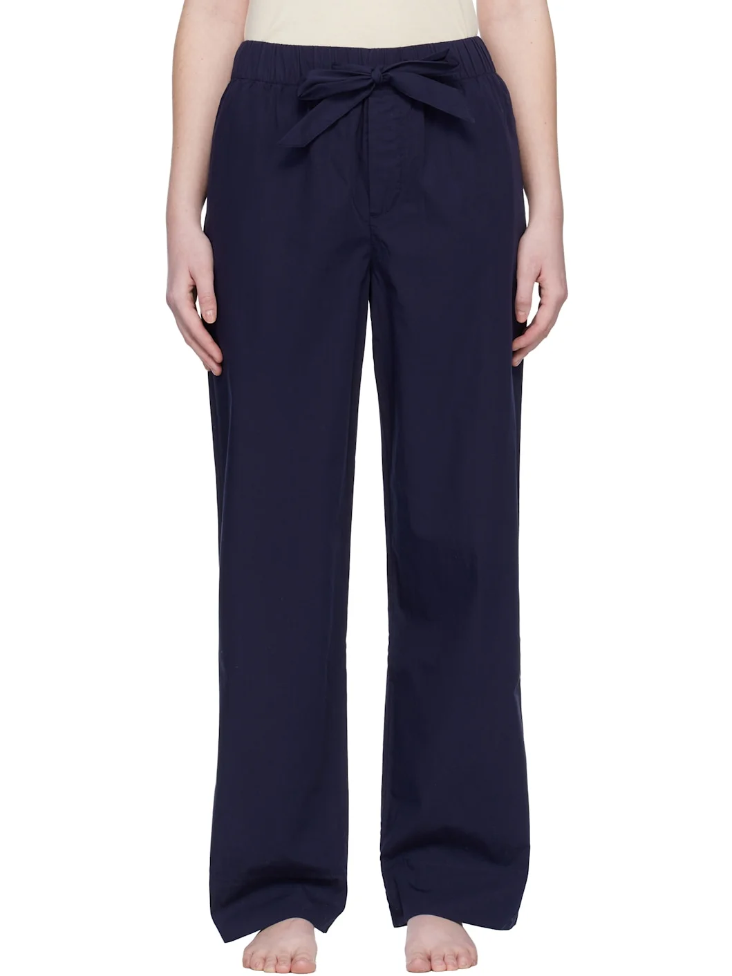 122 gsm organic cotton poplin pyjama pants. · GOTS-certified · Straight-leg · Drawstring at elasticized waistband · Three-pocket styling · Button fly · Logo patch at back pocket · Mother-of-pearl hardware Supplier color: True navy 100% organic cotton. Made in Portugal 261482F079028