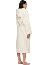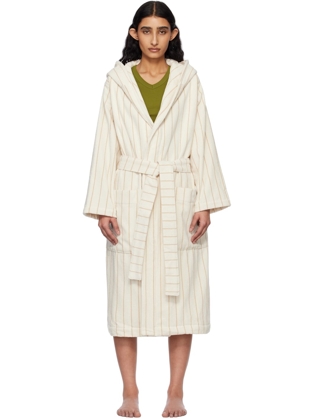 Heavyweight 385 gsm organic cotton terrycloth bathrobe. Stripes throughout. - GOTS- and Oeko-Tex® Standard 100-certified - Hood at shawl lapel - Open front - Belt loops and detachable self-tie belt - Patch pockets - Logo flag at side seam - Locker loop at inner collar Supplier color: Sienna stripes
