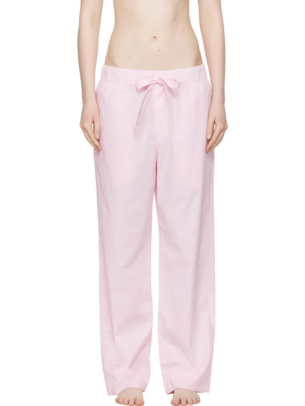 Lightweight organic cotton poplin pyjama pants. · Certified OEKO-TEX® Standard 100 · Straight-leg and loose-fit · Stonewashed · Drawstring at elasticized waistband · Three-pocket styling · Button fly · Logo patch at back pocket · French seams at interior · Mother-of-pearl hardware Supplier color: Soft pink 100% cotton. Made in Portugal 252482F079018