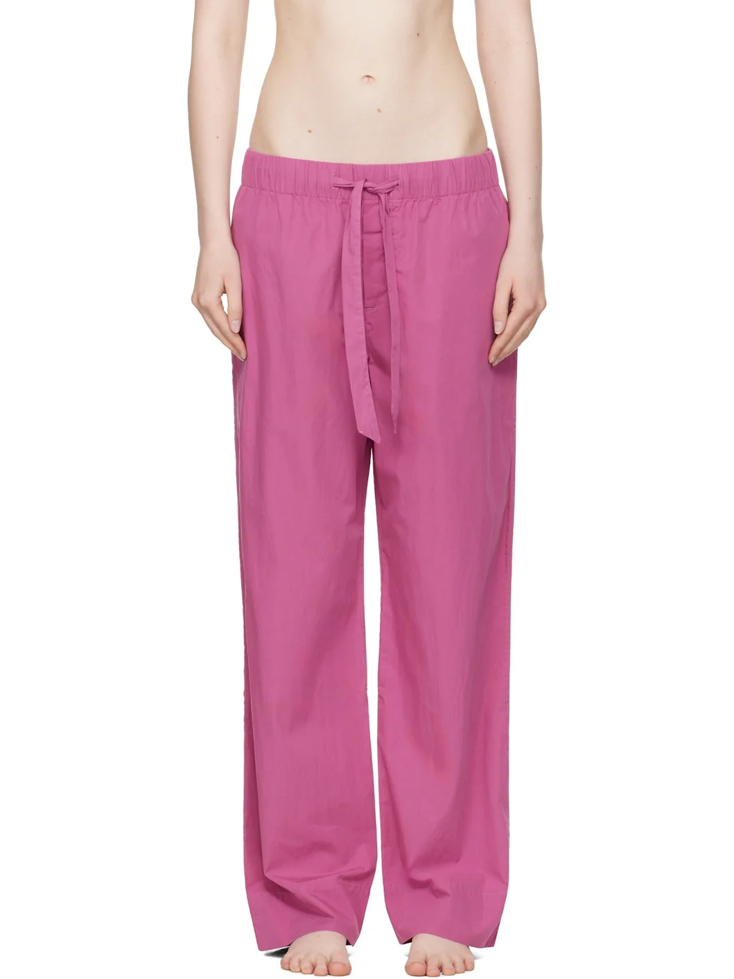 Lightweight organic cotton poplin pyjama pants. · Certified OEKO-TEX® Standard 100 · Straight-leg and loose-fit · Stonewashed · Drawstring at elasticized waistband · Three-pocket styling · Button fly · Logo patch at back pocket · French seams at interior · Mother-of-pearl hardware Supplier color: Lingonberry 100% cotton. Made in Portugal 252482F079029