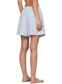 Lightweight stonewashed organic cotton poplin pyjama shorts. Stripes throughout. - Wide-leg and oversized - Oeko-Tex® Standard 100-certified - Drawstring at elasticized waistband - Four-pocket styling - Button fly - Logo patch at back pocket Supplier color: Placid blue stripes