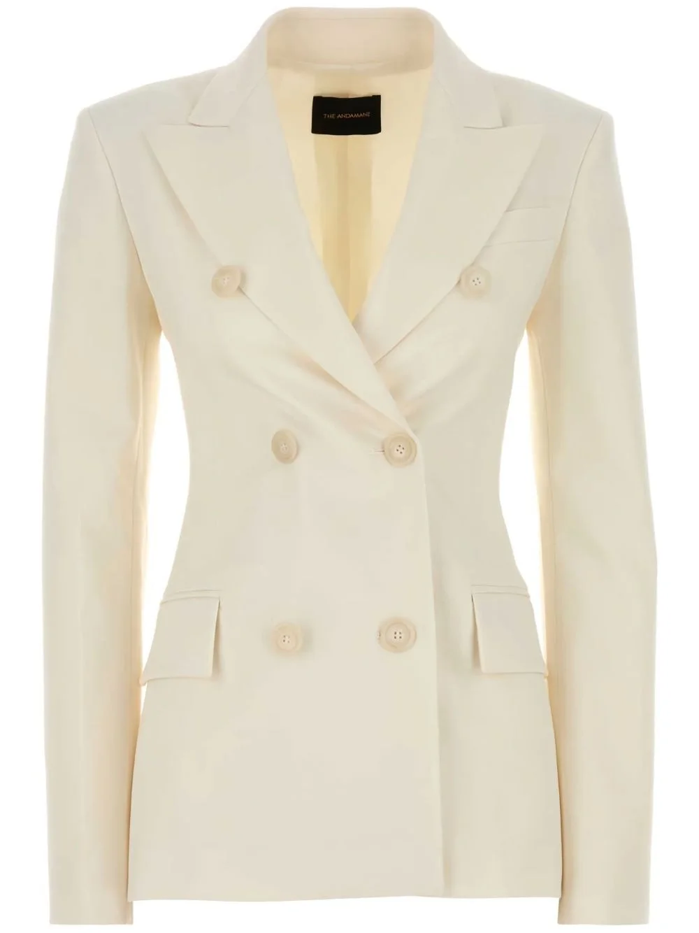 gabardine blazer Highlights - Ecru - Double-breasted button fastening - Shoulder pads - Buttoned cuffs - Two side flap pockets Made in Italy Composition Wool 100% SIZE & FIT FittingInformation Designed for a slim fit that sits just away from the body offering a close yet comfortable fit The internal shoulder pads offer a structured shape Made from a midweight fabric Washing instructions Read Manufacturer Guidelines