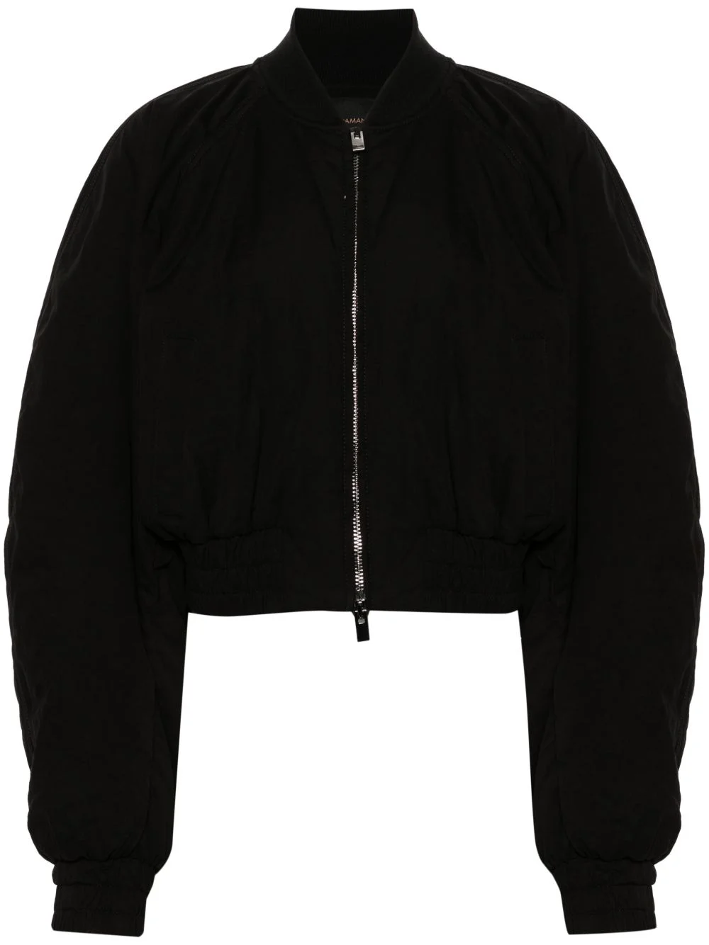 padded bomber jacket Highlights - Black - Padded design - Baseball collar - Long sleeves - Elasticated cuffs - Two press-stud fastening side pockets - Straight hem - Front two-way zip fastening Made in Italy Composition Outer: Cotton 45%, Polyester 39%, Polyamide 16% Lining: Polyester 100% SIZE & FIT Model measurements Height 5 ft 10 in(1.78 m) Bust/Chest 31.49 in(80 cm) Hips 37 in(94 cm) Waist 23.62 in(60 cm) FittingInformation Designed for an oversized fit, offering additional room throughout The elasticated hem allows for movement and a comfortable fit Made from a padded non-stretch fabric, giving it no natural elasticity This piece fits true to size – take your usual size Washing instructions Hand Wash