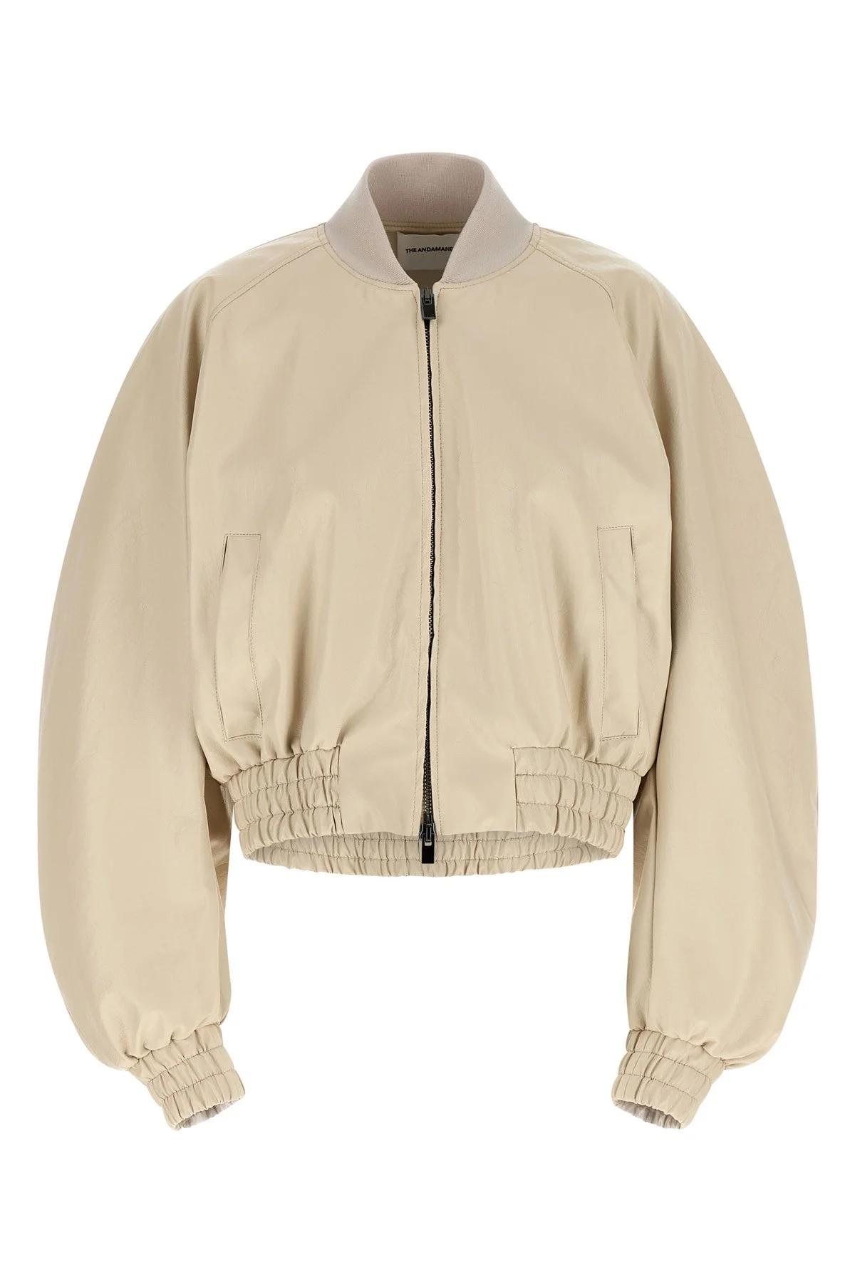 cod. T192016ATNP262OAT 'Sierra' bomber jacket in grainy leather-effect fabric, ribbed stretch high neck, front zip closure, pockets, long sleeves with elastic cuffs and dropped shoulder, elastic hem. Color: Beige Size & Fit: oversized fit Composition: 58% polyurethane 26% viscose 5% cotton 5% af 4% polyester 2% metal Made in: Italy